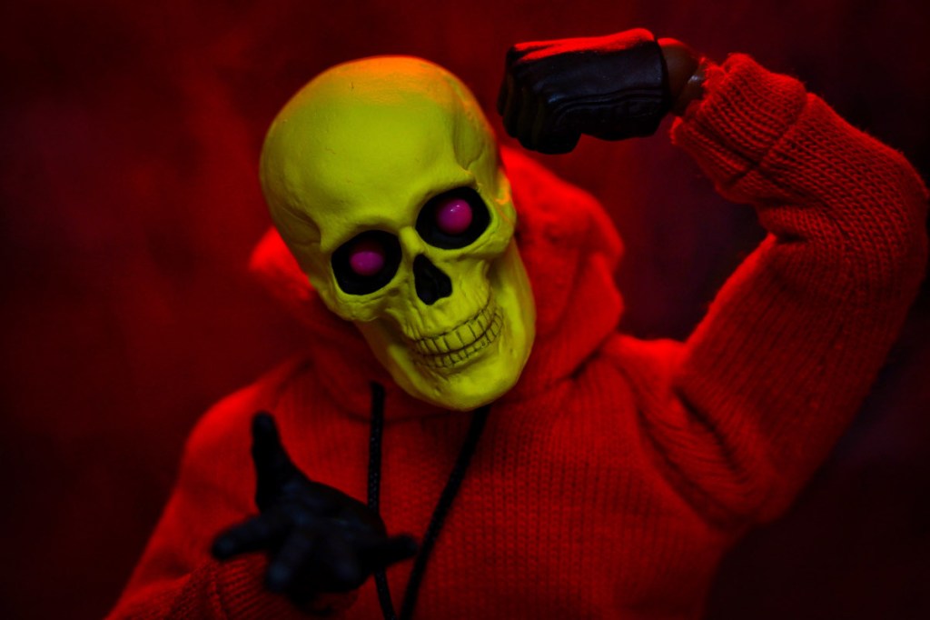 This four pack of skulls is compatible with MEZCO One:12 figures. Its just a small box with four skukls that are identical except for their striking colours. I popped each skull on to a different Mezco Rumble Society figure and grabbed a portrait of each.