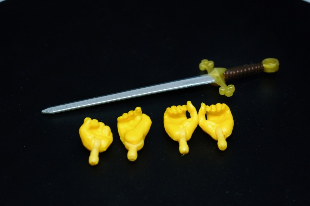 The sword looks pretty good though the early gold accents look a bit cheap as they are slightly translucent and three of the hands being holding hands for one accessory feels a bit odd. An open hand or pointing hand would have been more useful. And I would have LOVED an extra head sculpt. Maybe a torn or dirty mask or even just a slightly different expression with the eyes.