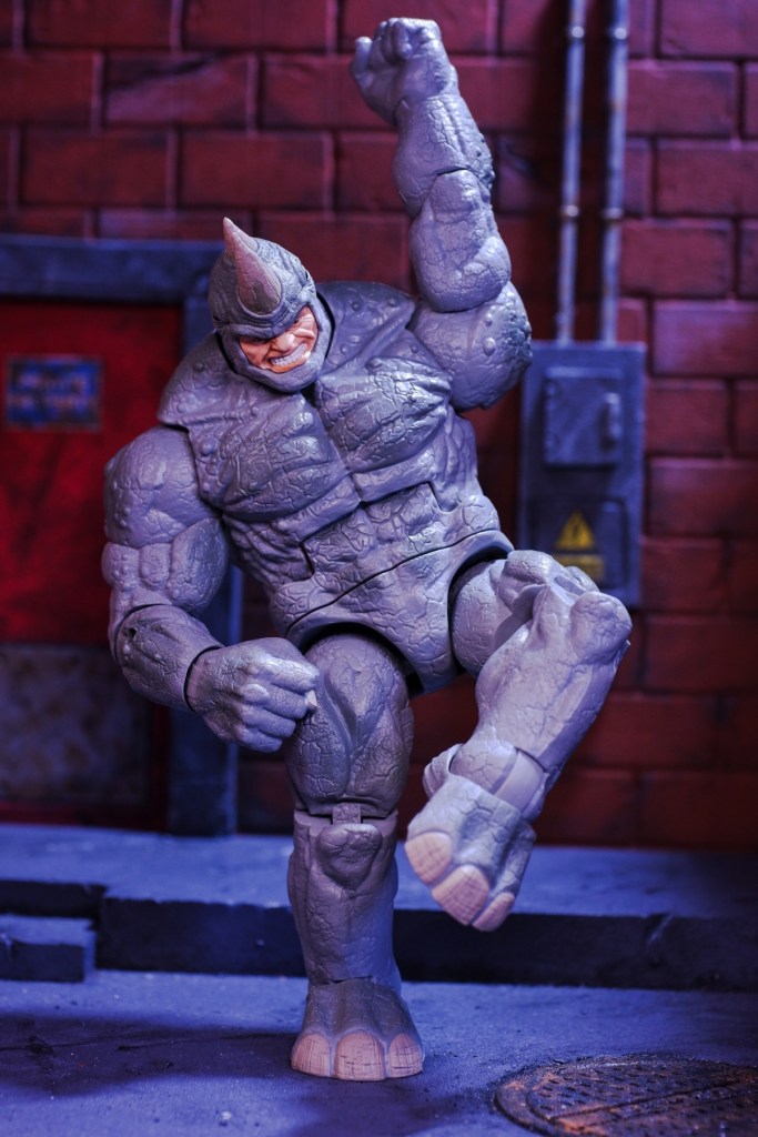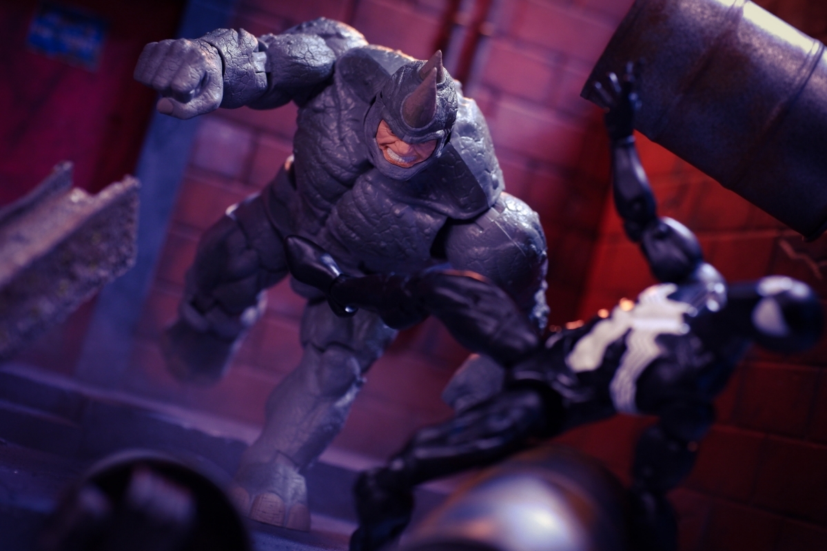 Despite the lack of double-jointed arms and legs he can easily be moved into some really good poses. Firstly his neck & head move up and down a lot, important for getting that rhino horn down and ready to attack. Perfect ankle articulation and his low centre of gravity make it very easy to pose him on one leg charging at our friendly neighbourhood Spider-Man.
