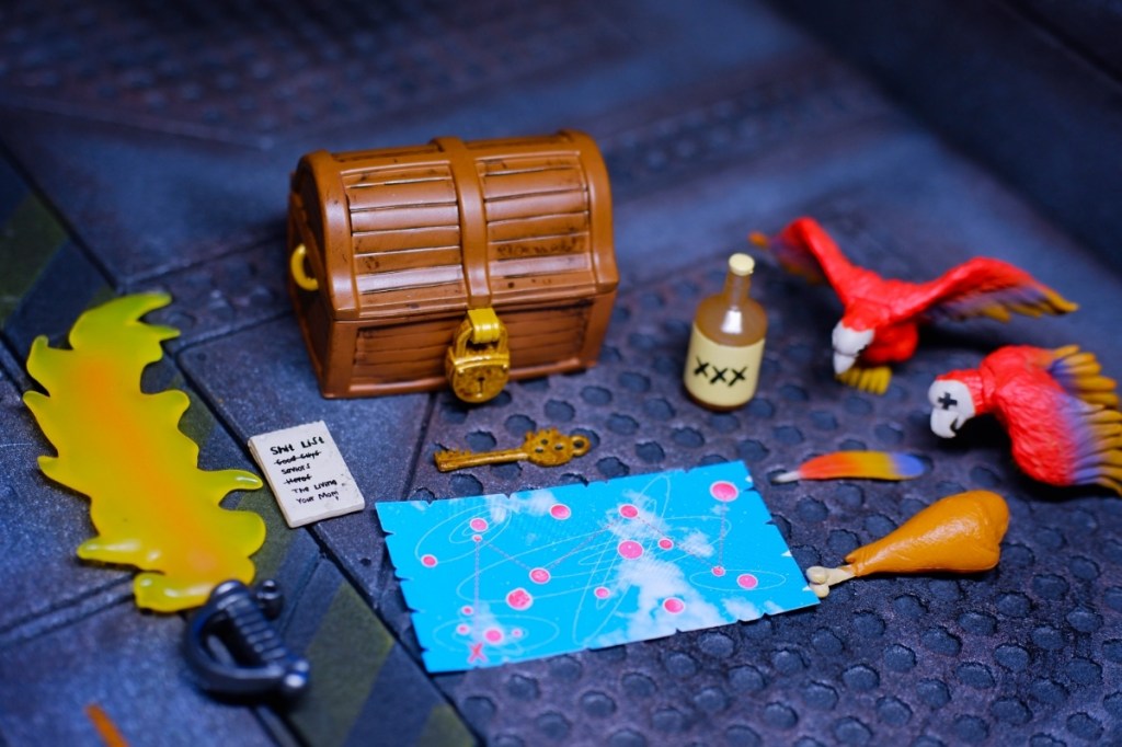 Furthermore, the array of accessories, such as the treasure chest, key, parrot, bottle of grog (or perhaps rum), and a treasure map, allows for imaginative play and opens up a world of storytelling possibilities.