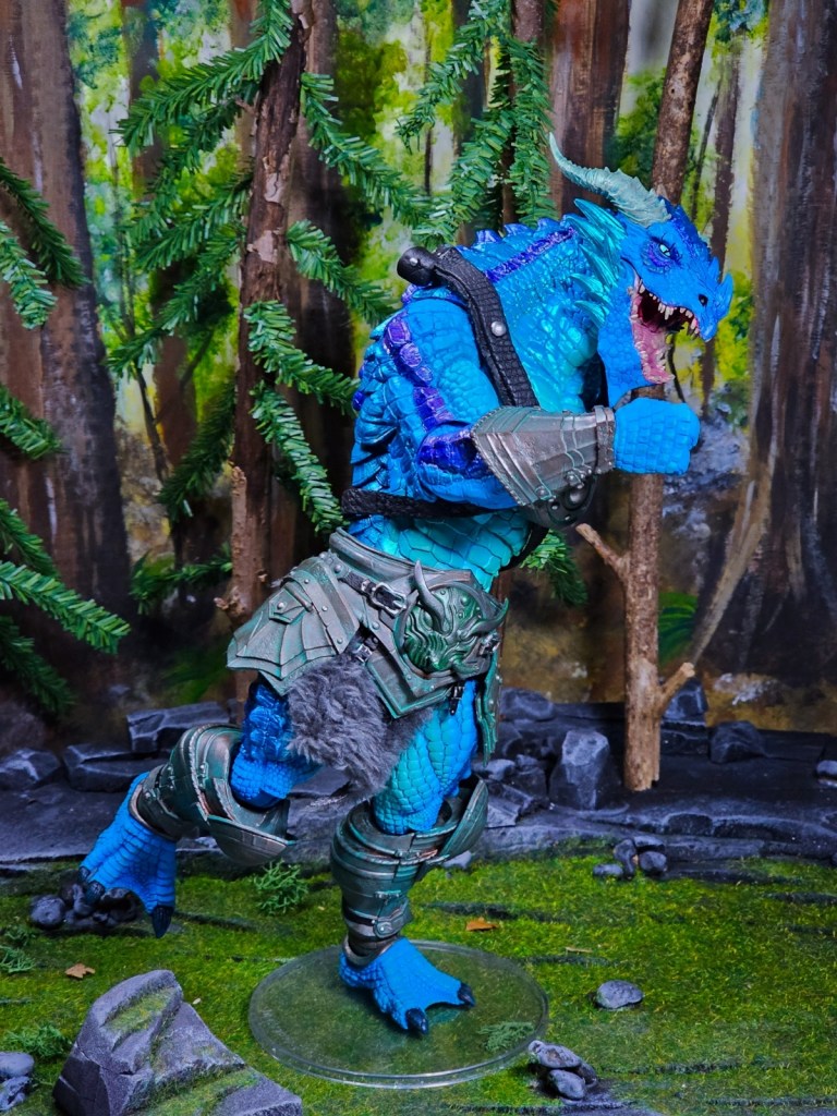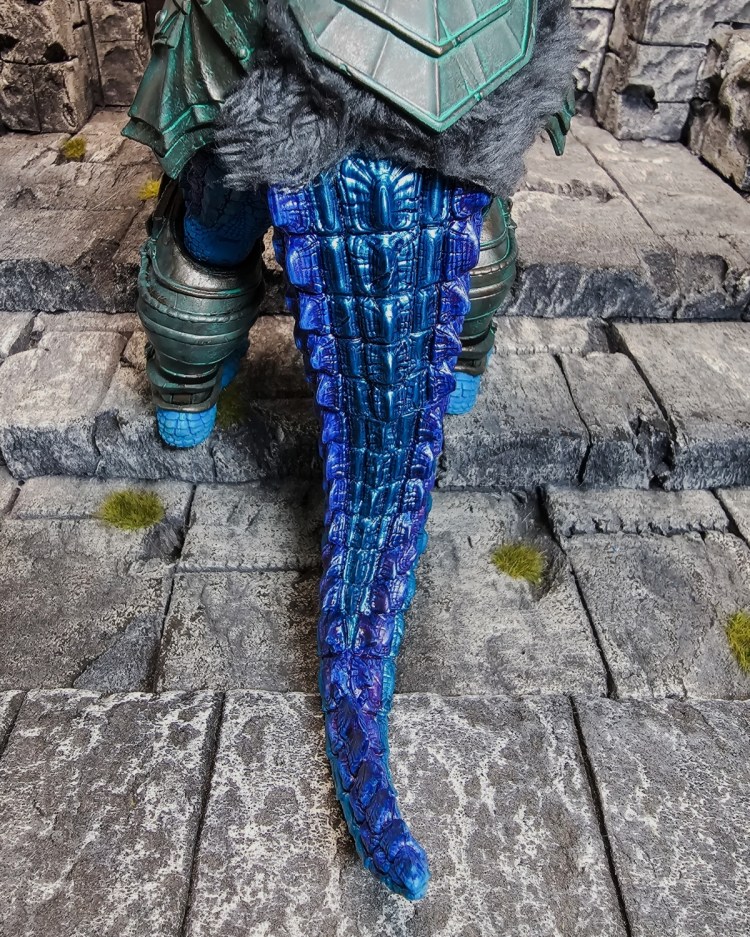 His tail came as a separate part that slips around the ball joint at the waist. Its a bit fiddly but preferable to popping the torso out. I’ll be displaying mine without the tail since D&D dragonborn don’t typically have those. But that tail does look good, so I may change my mind!. The tail is a sturdy plastic and has a cut about two thirds down for articulation.