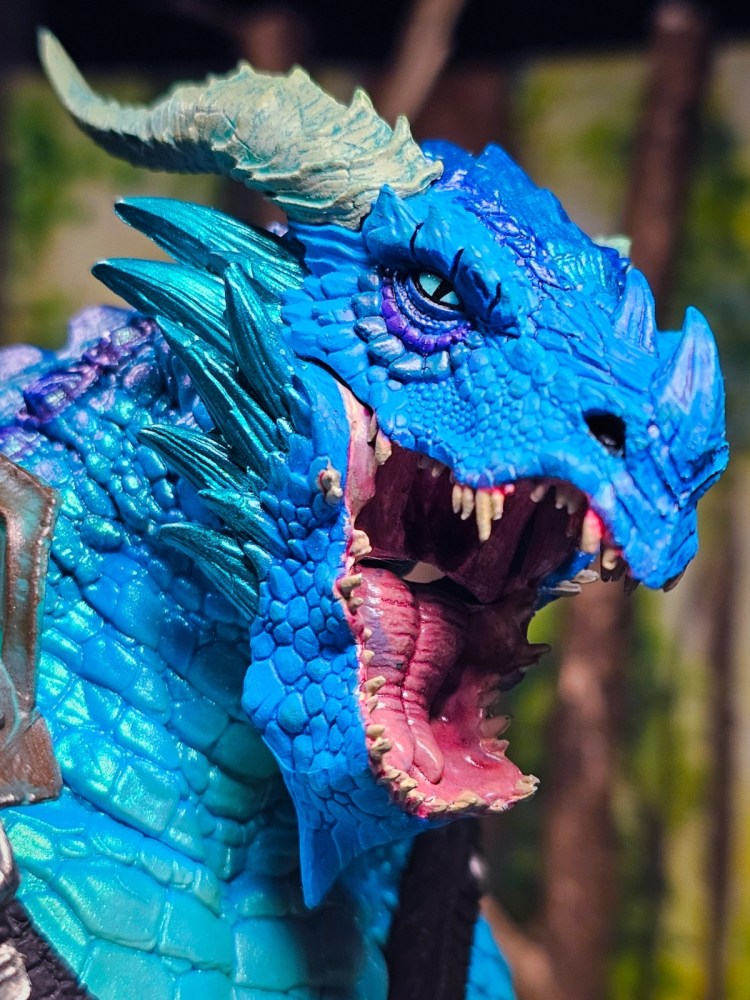 As you can see from the comparison, he’s not just a recolour of other ogres, he has a unique scaly mold that is both beautifully sculpted and painted. His base blue colour is accented with striking metallic purple and teal. The quality of this paint work is exceptional both in important small areas like the eyes but also on all limbs and even the tail.
