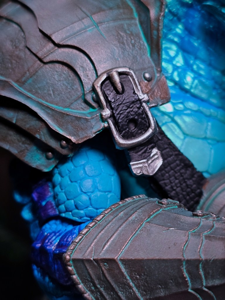 Details extend to his armour plating which has delicate blue and rust coloured accents and his buckles have silver paint applied.
