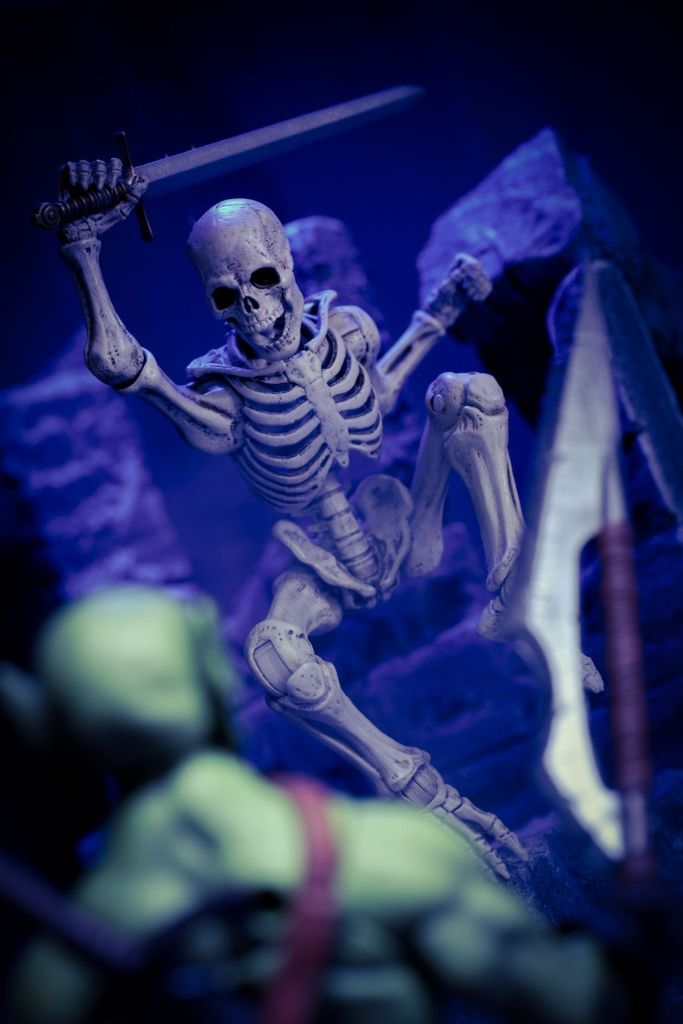 The legs too allow for a very wide stance and the single joints move just about enough to work with that. He has no waist articulation, but to be fair he doesn’t really have a waist. There is a ball joint up in the rib cage though so you can still get the Skelly to bend and twist his body enough using that.