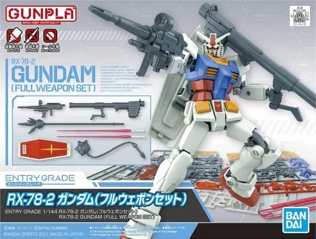 The Gunpla Entry Grade RX-78-2 Gundam Full Weapon Set features easy assembly, pre-coloured parts, and enhanced armament! It’s perfect for beginners new to the world of Gunpla. You won’t need glue, paint, or stickers to complete the project. In addition to the beam rifle and shield included in the standard edition, this version comes with two beam saber effects, a beam javelin, a hyper bazooka, and a Gundam hammer.