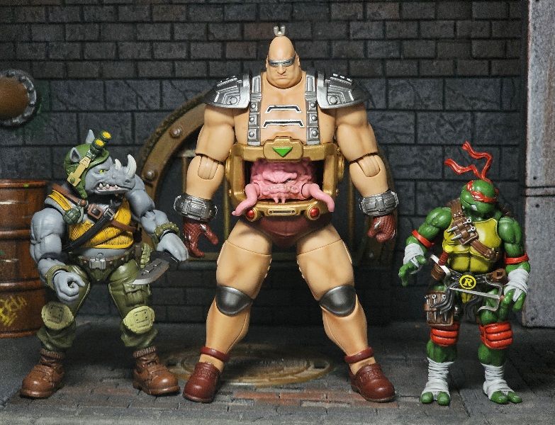 As mentioned, these figures are 1:18 scale, meaning most of the turtles stand around 3–4 inches tall. Larger characters like Krang’s android body and the Triceraton soldier stretch closer to 6 or 7 inches, towering over the heroes in a half shell — just as they should.